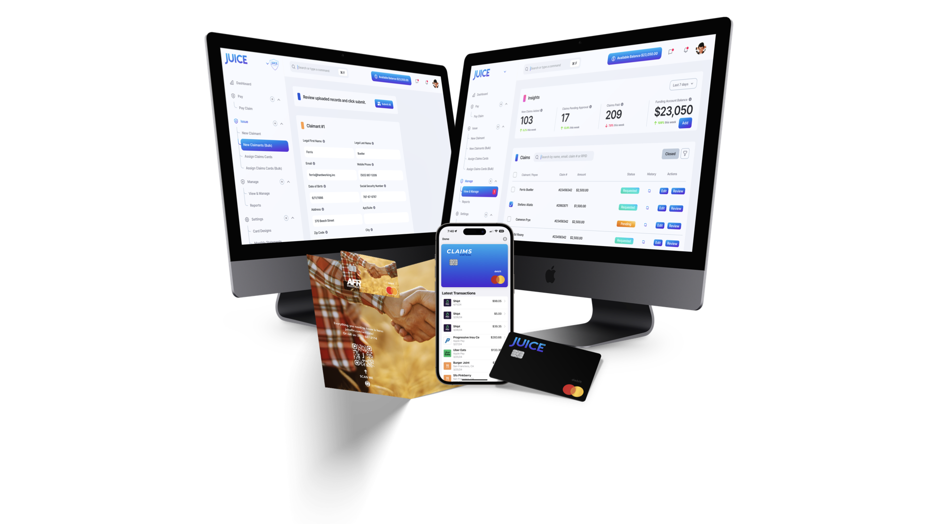 Juice provides carriers and their networks, deeply co-branded portals, apps and embedded digital payment solutions focused on elevating the claimant and beneficiary experience so that the last mile is always on brand, fully managed and frictionless.