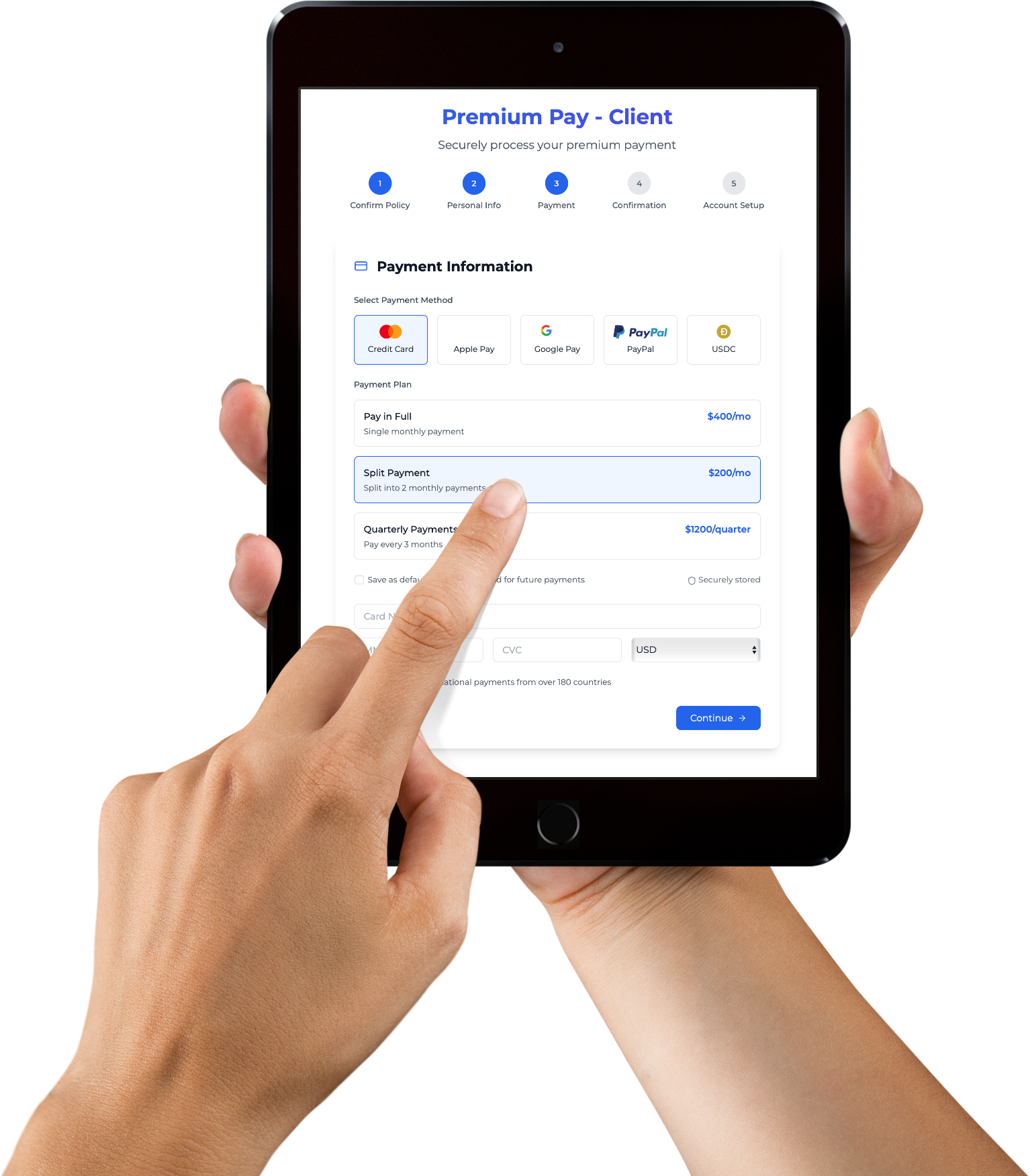 Collect premiums using co-branded payment link / page with leading payment options including: credit, debit, bank account, stablecoin etc.